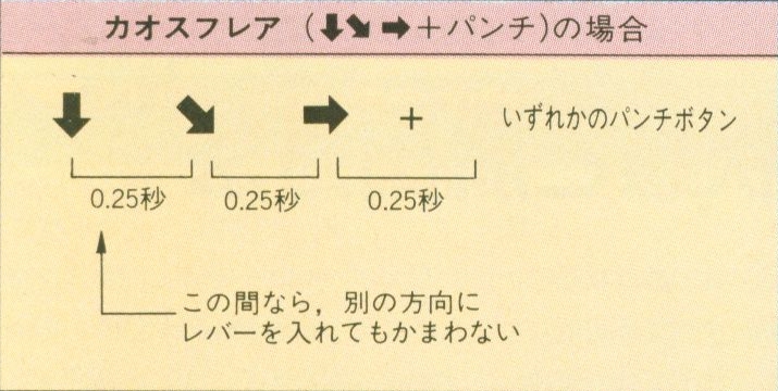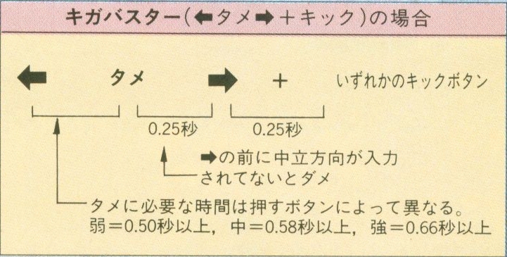 필살기 입력의 각 커맨드 간의 시간은 보통 0.25초이며, 모으기 커맨드에서 모으는 시간으로는 약=0.5, 중=0.58, 강=0.66 이다. 알아보기 쉽게 그림으로 표현하자면 아래와 같다. 일본의 공식 공략 사이트에서 가져와서 일본어이기는 하나 간단한 한자 몇 개만 안다면 이해하기 쉬울 것이다. 딱히 이해를 못하더라도 게임을 즐기는 데에는 아무런 지장이 없다.