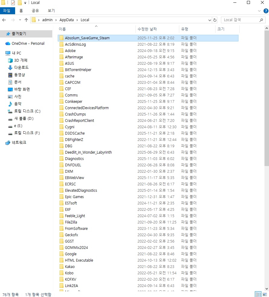 여기서 Absolum_SaveGame_Steam 폴더를 찾으면 그 폴더 안에 세이브 파일이 있다.