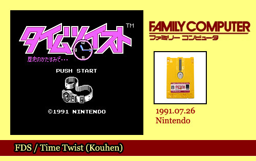 <타임트위스트>는 마니아라면 알만한 어드벤쳐 명작 <패미콘 옛날이야기 신 키니가시마>(1987)의 스탭이 만들었다. 악마에게 몸을 빼앗겨 버린 주인공이 시간여행하는 악마를 쫓아 다양한 시대로 날아간다. 1428년의 프랑스에서 잔 다르크를 구하고, 고대 그리스에서 소년시절의 알렉산더 대왕을 만나는 등 역사판타지물 장르의 게임이다. 주인공은 자신이 날아간 시대의 사람들 몸에 빙의해서 수수께끼를 풀어나간다. 중간중간에 역사 상식 퀴즈를 풀지 못하면 게임진행이 안되기 때문에 어느정도 약사상식도 필요한 작품이다.